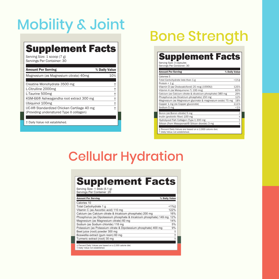 Bone remodeling occurs in multi-month cycles. Consistent intake of Vitamin D3, K2 (MK-7), calcium, magnesium, boron, silicon, and collagen supports the structural and regulatory components required for ongoing bone turnover. Meaningful support can only be assessed over time.